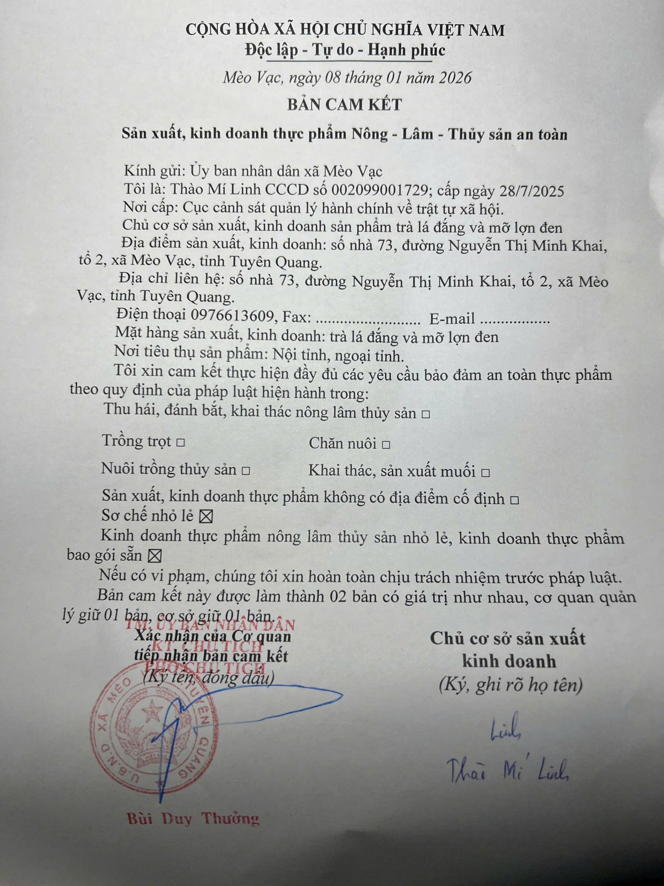 Xuất xứ : Số nhà 73, đường Nguyễn Thị Minh Khai, Tổ 2, Xã Mèo Vạc, Tỉnh Tuyên Quang, Việt Nam